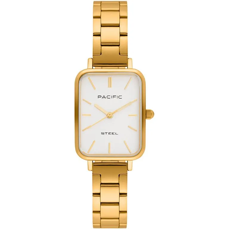 Zegarek damski Pacific złota prostokątna koperta, złota klasyczna bransoletka, biała tarcza i indeksy - SLB-1602 klasyczna elegancja w ponadczasowej formie