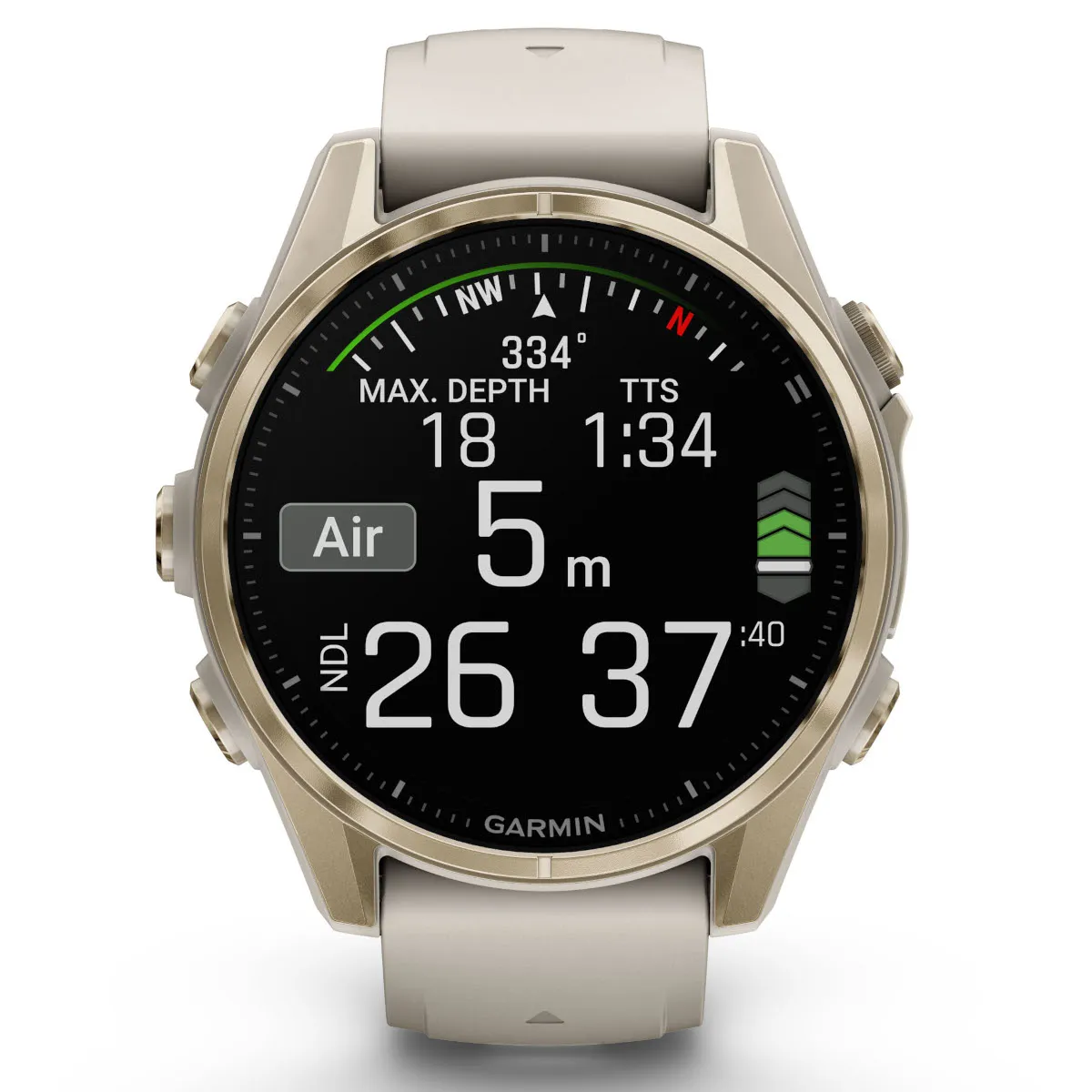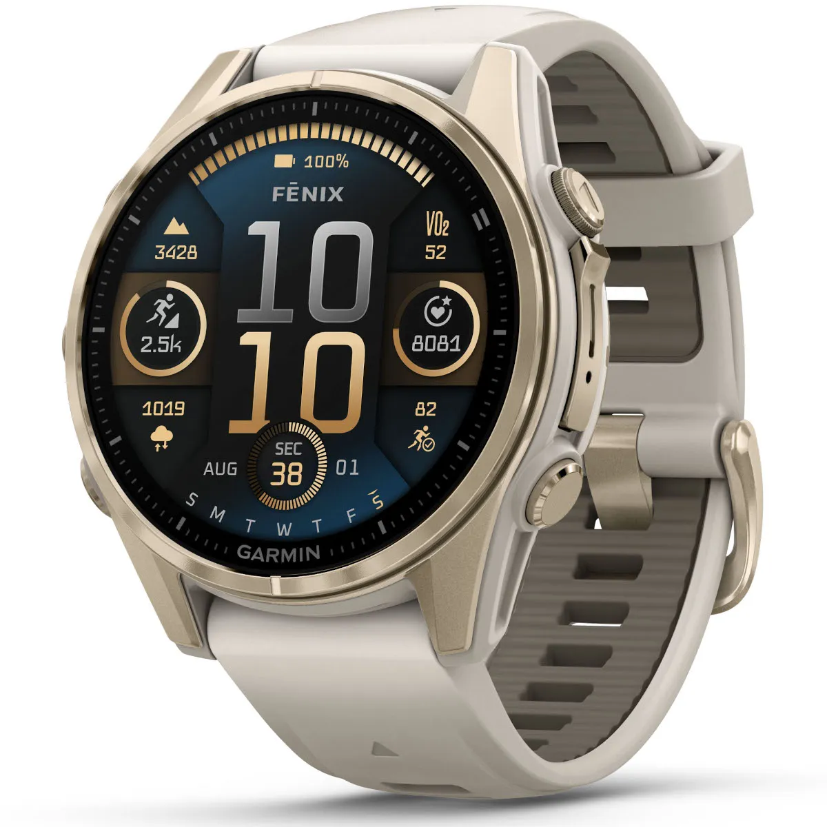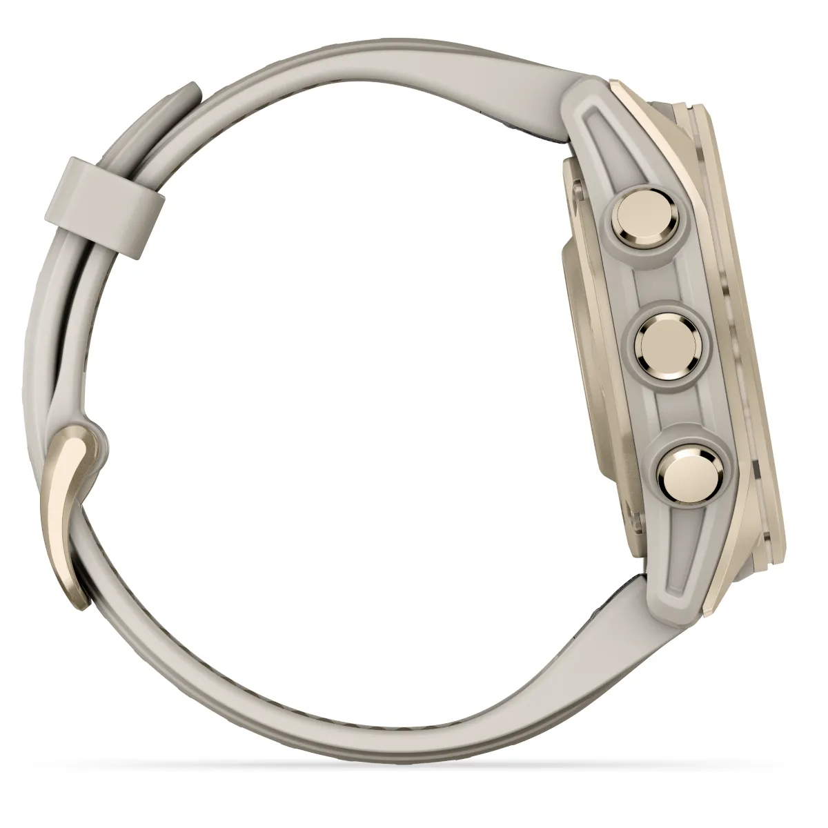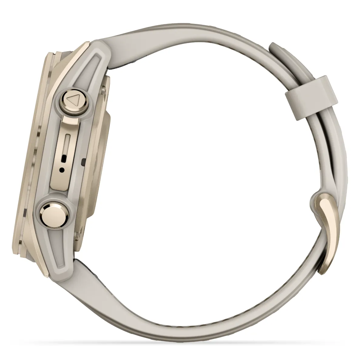 Dane techniczne Garmin Fenix 8 43 mm, AMOLED Sapphire, Soft Gold z paskiem silikonowym w kolorze Fog grey / Dark sandstone 010-02903-11