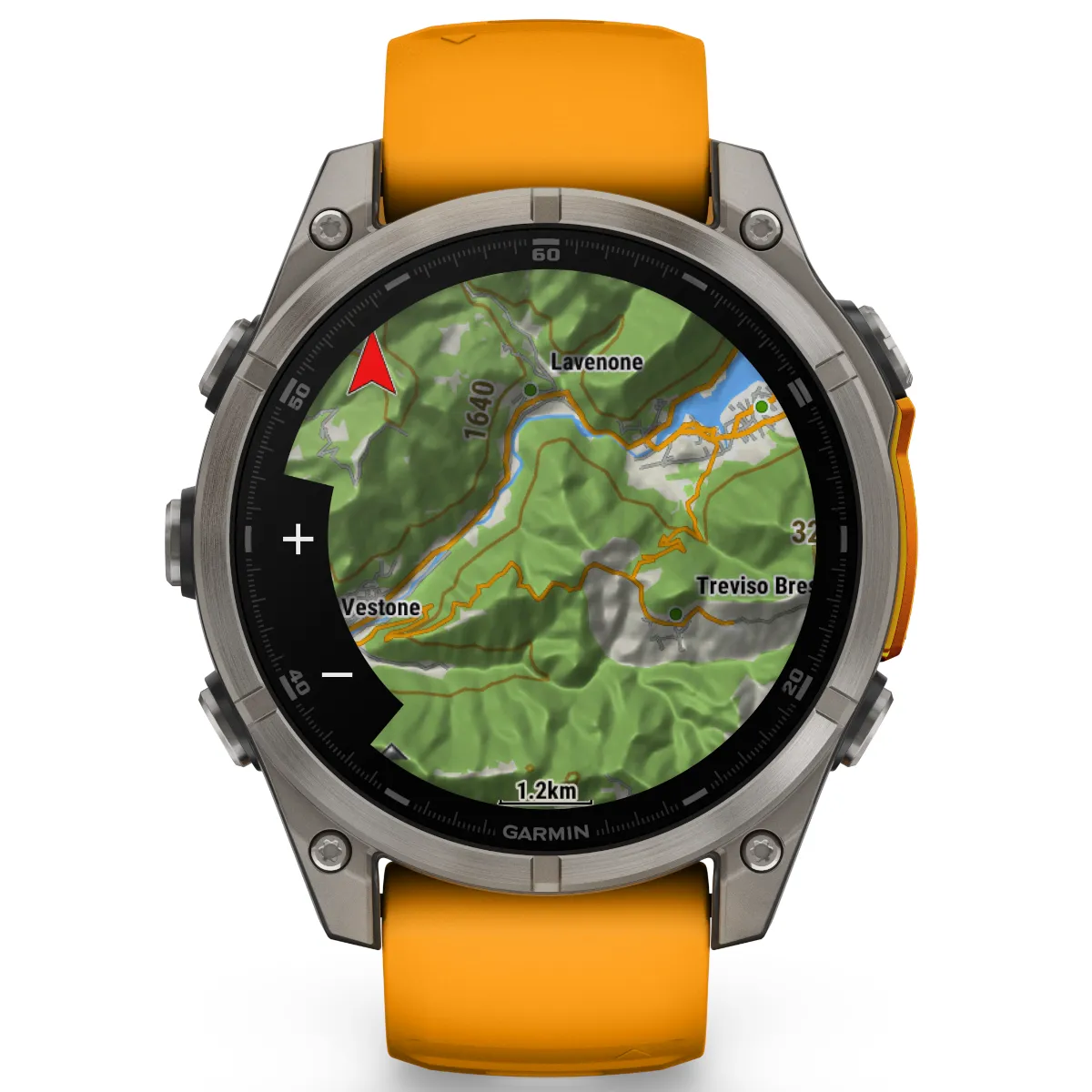Funkcja dynamicznego wyznaczania trasy w obie strony pozwala wprowadzić, jak daleko chcesz się udać — a następnie uzyskać sugerowane trasy, które poprowadzą Cię z powrotem i na czas. Można również wyświetlić kontury terenu na mapach TopoActive (Mapy TopoActive są dostępne fabrycznie w modelach fēnix 8 Sapphire) i uzyskać dostęp do wstępnie załadowanych map pól golfowych i ośrodków narciarskich na całym świecie.