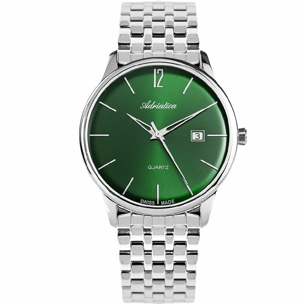 Zegarek Adriatica, z linii A8254 działa na precyzyjnym mechanizmie kwarcowym, zasilanym za pomocą baterii, który charakteryzuje się wysoką dokładnością w pomiarze czasu - zakres tolerancji wynosi ok. +/- 15 sekund w przeciągu 30 dni. Koperta, o szerokości 42.00 mm, jaką posiada zegarek Adriatica A8254.5150Q wykonana została z antyalergicznej, odpornej na korozję, wysokiej jakości stali szlachetnej i ma kolor srebrny. Jej kształt jest okrągły i idealnie komponuje się z dopasowaną bransoletą, której materiał wykonania - stal szlachetna o wysokiej odporności - gwarantuje komfortowe użytkowanie. Tarcza w tym modelu ma kolor zielony, a pełne godziny zostały oznakowane przez Cyfry Arabskie i indeksy, dzięki czemu zegarek Adriatica A8254.5150Q jest czytelny. Tarczę tego czasomierza chroni szkło mineralne.