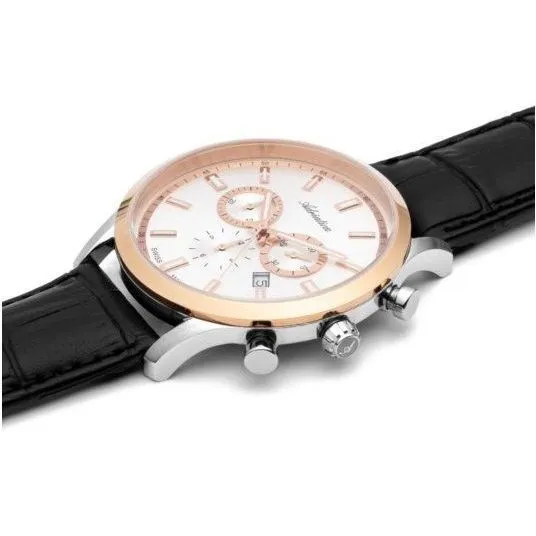 Zegarek męski Adriatica A8150.R213CH na czarnym pasku z skóry naturalnej, biala tarczą, która otoczona jest złotym pierścieniem, oznaczeniami w formie indeksów , datownikiemi . Szwajcarski zegarek z mechanizmem Ronda.