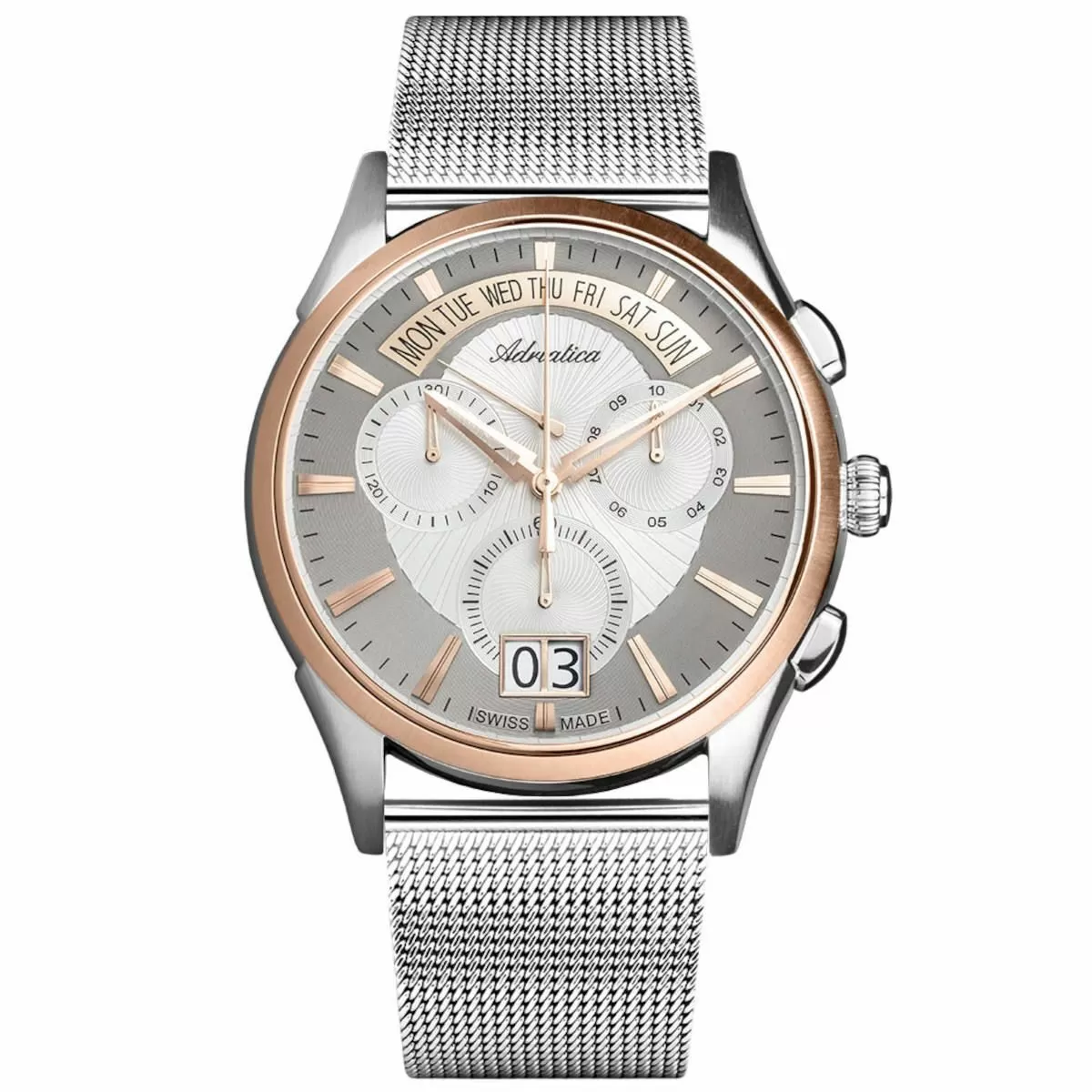 Zegarek męski Adriatica A1193.R113CH to niezwykle elegancki model szwajcarskiej produkcji, którego podstawę stanowi koperta ze stali szlachetnej w kolorze różowego złota i srebrnym, połączona z bransoletą, kryjąca srebrną tarczę z indeksami na pełnych godzinach. Jak wszystkie zegarki Adriatica, model A1193.R113CH został stworzony w oparciu o długoletnią historię zegarmistrzowską. Solidne, dokładne i niezawodne, takie właśnie muszą być zegarki męskie opatrzone logiem Swiss Made.