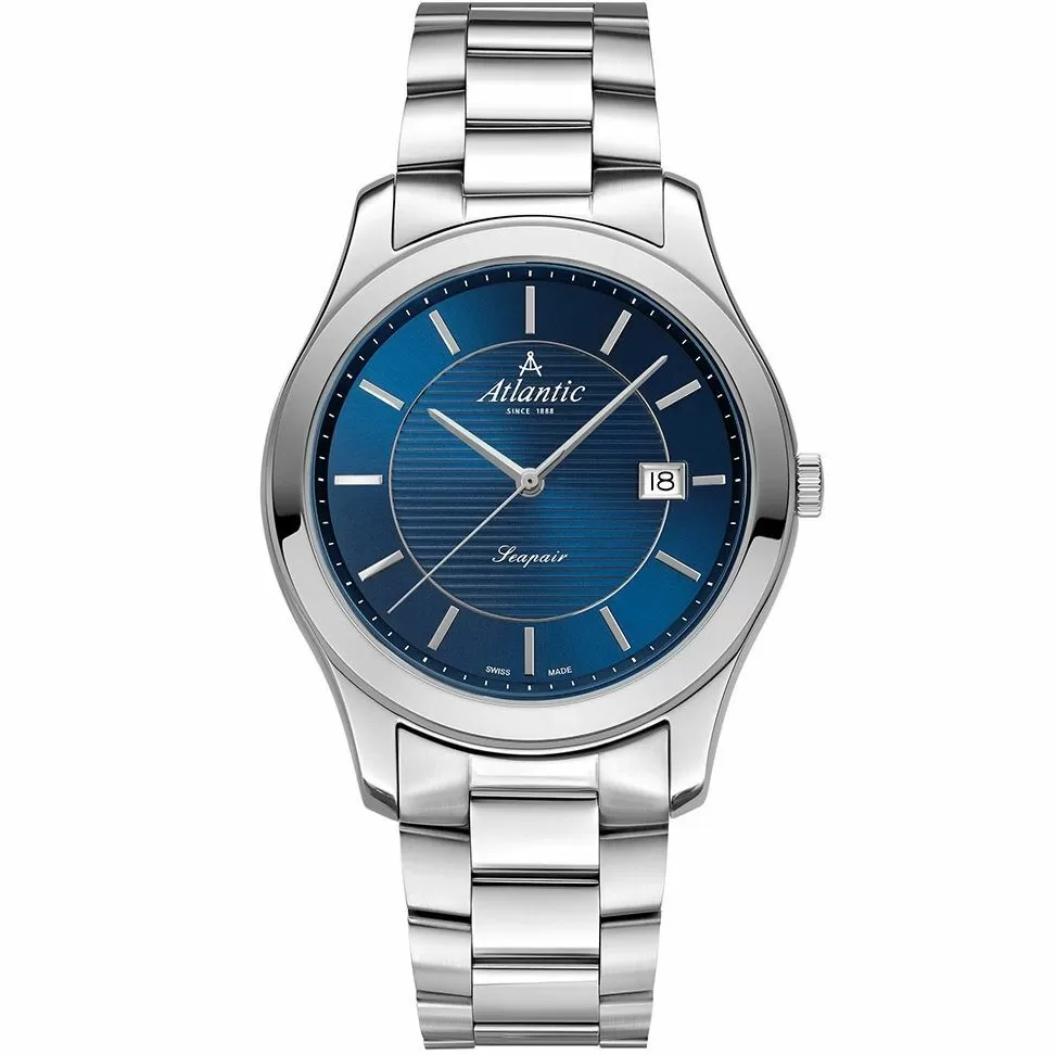 Precyzyjny pomiar czasu zapewnia zastosowany kwarcowy mechanizm, zasilany przez baterię, który ukryty został pod niebieską tarczą. Pełne godziny oznakowane zostały przez indeksy. Wskazówki są proste i czytelnie wskazują godzinę. Model 60335.41.51 oferuje wskazanie aktualnej godziny z dokładnością do jednej sekundy oraz datownik, wskazujący dzień miesiąca w dyskretnym okienku na wysokości godziny trzeciej. Górną część tarczy zdobi rozpoznawalne logo marki Atlantic. Centralna część cyferblatu posiada poziomą teksturę.