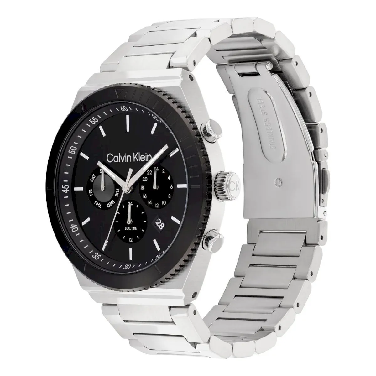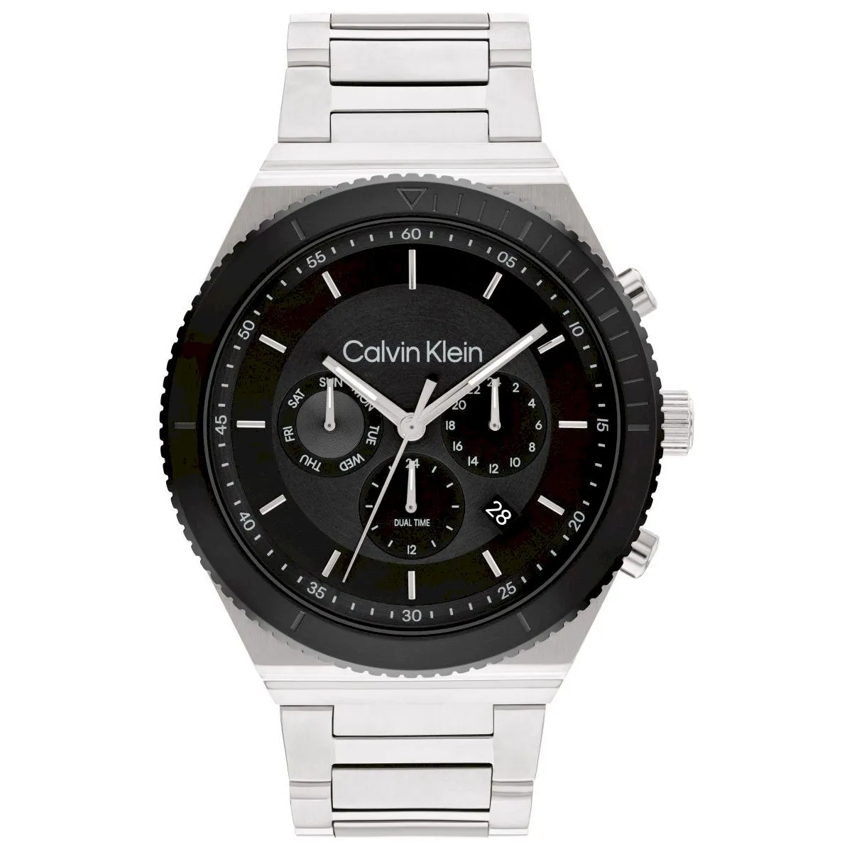 Zegarek Calvin Klein 25200301 z kolekcji Fearless z obudową w kolorze srebrnym, czarną tarczą i srebrną bransoletką: