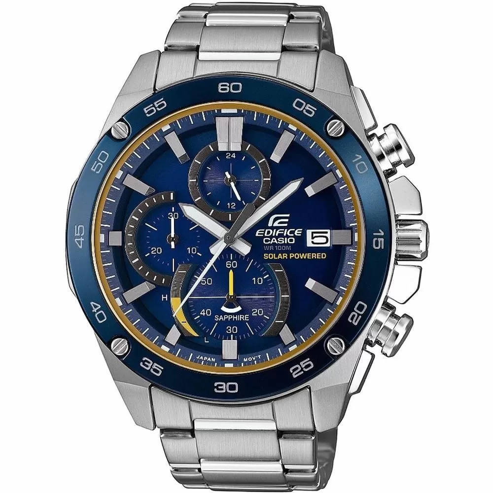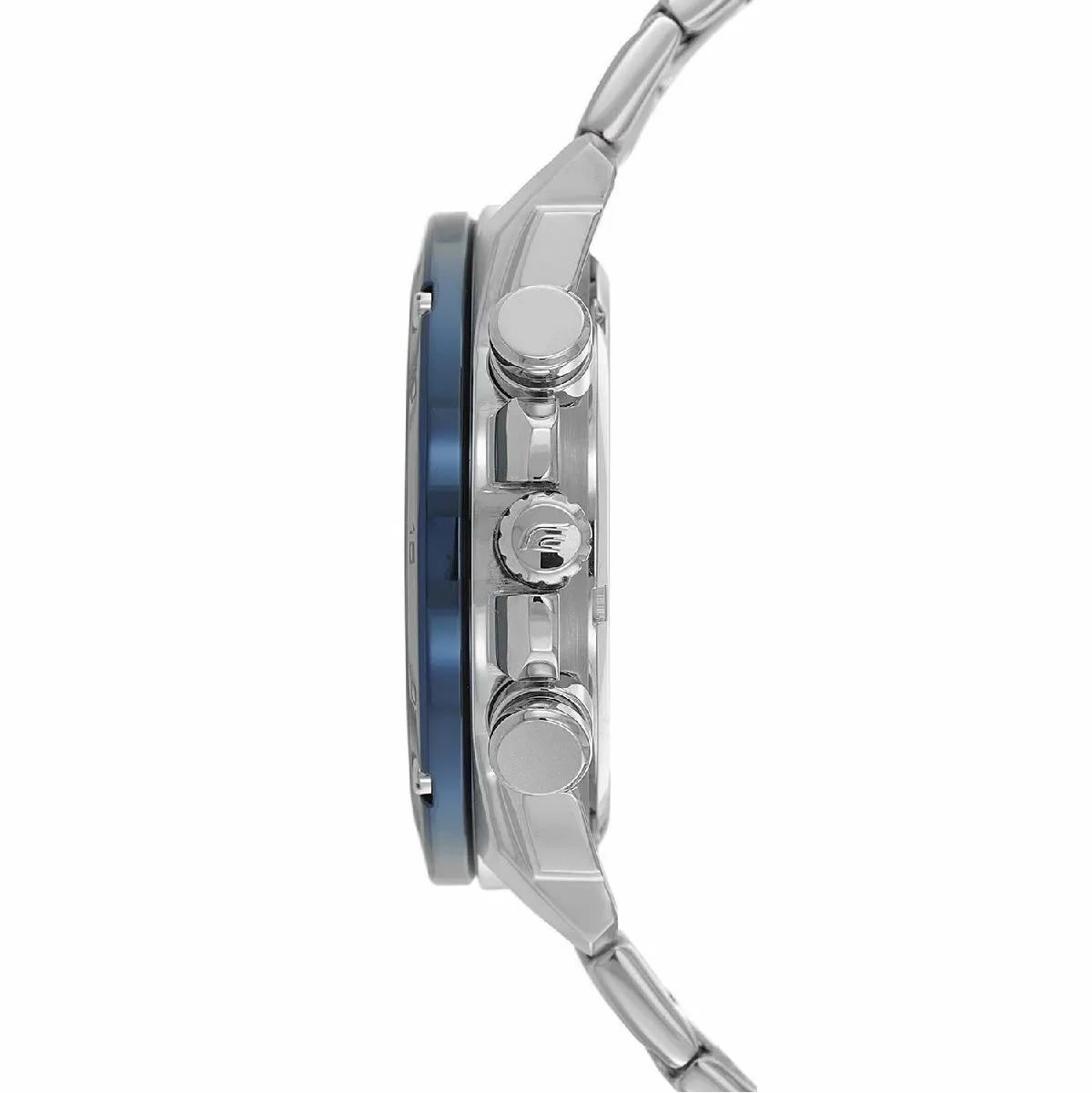Zegarek Casio EFS-S500DB-2AVUEF z kolekcji EDIFICE to model w srebrnej i niebieskiej kolorystyce o sportowo-eleganckim charakterze, ze stalową bransoletą i atrakcyjną tarczą o dynamicznym designie. To połączenie elegancji, klasy, wysokiej jakości i nowoczesnej technologii. Przede wszystkim zegarek zwraca na siebie uwagę swoim masywnym wyglądem, ale także charakteryzuje się wysoką precyzją wskazań - prócz pomiaru czasu posiada datownik oraz chronograf, czyli analogowy stoper. Wszystko w wysokiej jakości wykonaniu z wyselekcjonowanych materiałów. Koperta wykonana została ze stali szlachetnej i ma okrągły kształt. Połączono ją z stalową bransoletą gwarantującą wysoki komfort. Sercem zegarka Casio EFS-S500DB-2AV jest precyzyjny mechanizm kwarcowy, zasilany przez energię słoneczną. Cyferblat jest niebieski, z dodatkowymi żółtymi akcentami i z oznaczeniami pełnych godzin w postaci indeksów. Na wysokości godziny trzeciej umieszczono okienko datownika. Dodatkowe tarcze, wykorzystywane przy funkcji stopera mają kształt okrągły. Cyferblat przykryty został niezwykle odpornym na zarysowania szkiełkiem szafirowym. Na pierścieniu zastosowano wzmacniające, podkreślające męski charakter stalowe nity.  Zegarek Casio EFS-S500DB-2AVUEF jest wodoszczelny w klasie 10atm (100m) - przy tej klasie wodoszczelności dozwolone jest kąpiel, pływanie z nurkowaniem bez akwalungu. Nie wolno używać przycisków pod wodą.