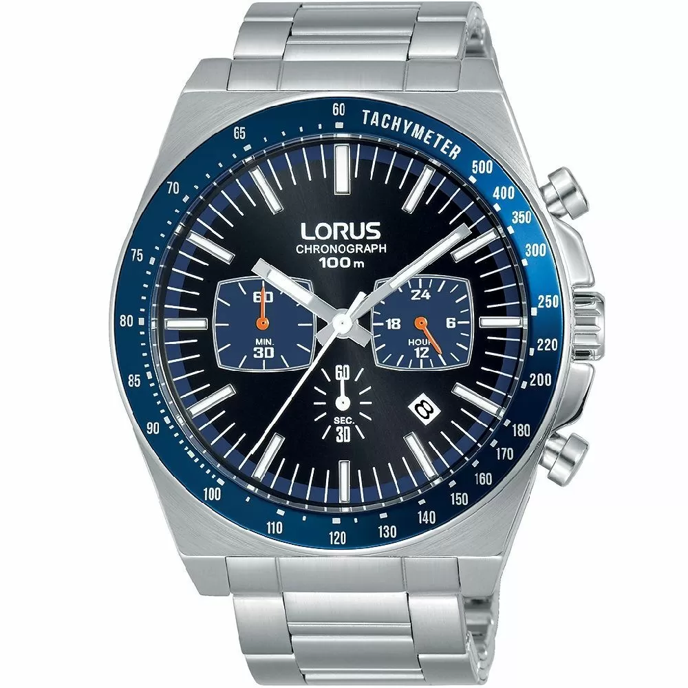 Zegarek męski Lorus RT347GX9 to uniwersalny model działający na mechanizmie kwarcowym, zasilanym przez baterię, który charakteryzuje się niskim odchyleniem w pomiarze czasu (zaledwie +/- 10 sekund w skali miesiąca). Został on ukryty pod prostą tarczą w ciemnym odcieniu, na której pełne godziny zostały oznakowane przez indeksy, poprawiające czytelność już na pierwszy rzut oka. Całość chroni odporne na delikatne przerysowania szkiełko mineralne, zamykające okrągłą kopertę o szerokości 46 mm. Obudowa ma grubość 12 mm, co zapewnia komfortowe użytkowanie w każdej sytuacji i została zaprojektowana tak, aby zapewnić 10 ATM wodoszczelności, znakomicie sprawdzające się w codziennym użytkowaniu. Rewelacyjnie prezentuje się połączenie srebrno niebieskiej koperty ze stalową srebrną bransoletą. Prócz wskazania godziny, zegarek RT347GX9 oferuje datownik oraz chronograf, czyli analogowy stoper.