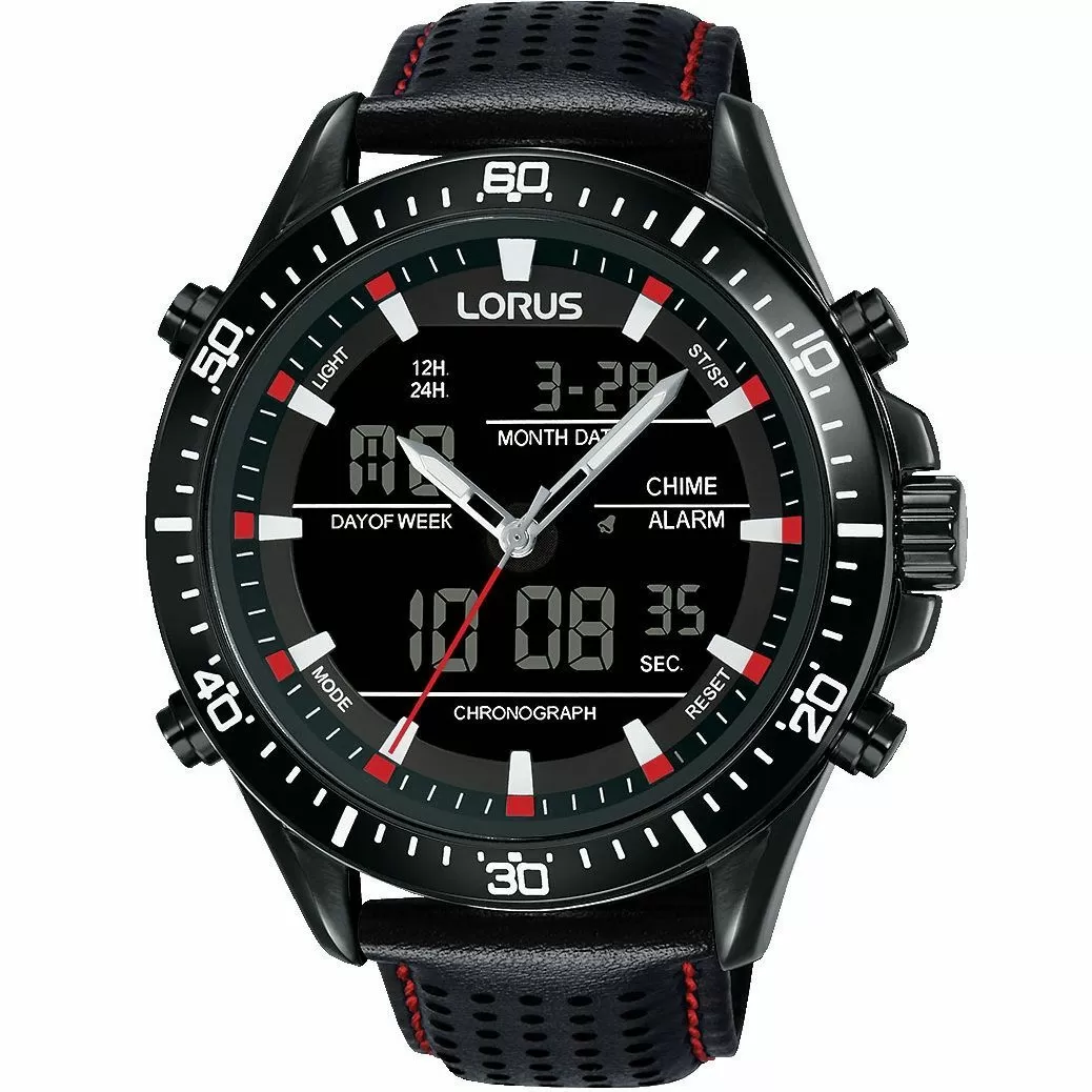 Zegarek Lorus RW645AX9 to prosty model działający na mechanizmie kwarcowym, zasilanym przez baterię, który charakteryzuje się niskim odchyleniem w pomiarze czasu (zaledwie +/- 10 sekund w skali miesiąca). Został on ukryty pod czytelną czarną tarczą, na której pełne godziny zostały oznakowane przez indeksy, poprawiające czytelność już na pierwszy rzut oka, a pod wskazówkami umieszczono wyświetlacz LCD. Całość chroni odporne na delikatne rysy szkiełko mineralne, zamykające okrągłą kopertę o szerokości 46 mm. Obudowa ma grubość 15 mm, co zapewnia komfortowe użytkowanie w każdej sytuacji i została zaprojektowana tak, aby zapewnić 10 ATM wodoszczelności, która pozwala na pływanie z nurkowaniem. Rewelacyjnie prezentuje się połączenie czarnej koperty z czarnym paskiem ze skóry. Model posiada analogowe - wskazówkowe - wskazanie czasu oraz wyświetlacz LCD i funkcje daty rozbudowanej z wiecznym kalendarzem, podświetlenie, drugi czas  stoper oraz alarm.
