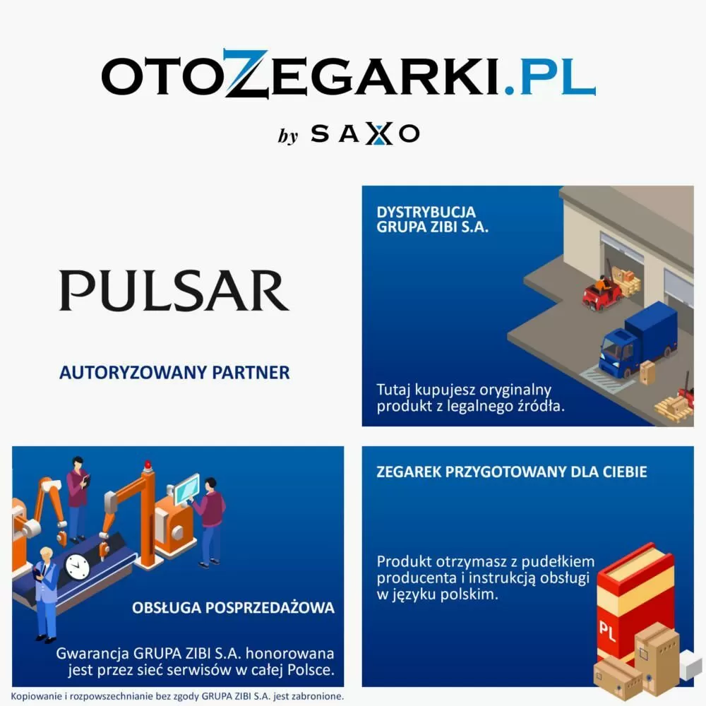 Kupując u nas w sklepie nie musisz obawiać się rozczarowania! Wszystkie japońskie zegarki Pulsar z naszej oferty to oryginalne, nowe i pełnowartościowe produkty, które pochodzą z legalnej polskiej dystrybucji ZIBI, która także zapewnia serwisowanie w Polsce i dostęp do części. Zakup w naszym sklepie jest całkowicie legalny i zgodny z polskim prawem, co gwarantuje Ci ochronę jako konsumenta w przypadku zakupów na odległość! Przy zakupie zegarka Pulsar otrzymujesz:
