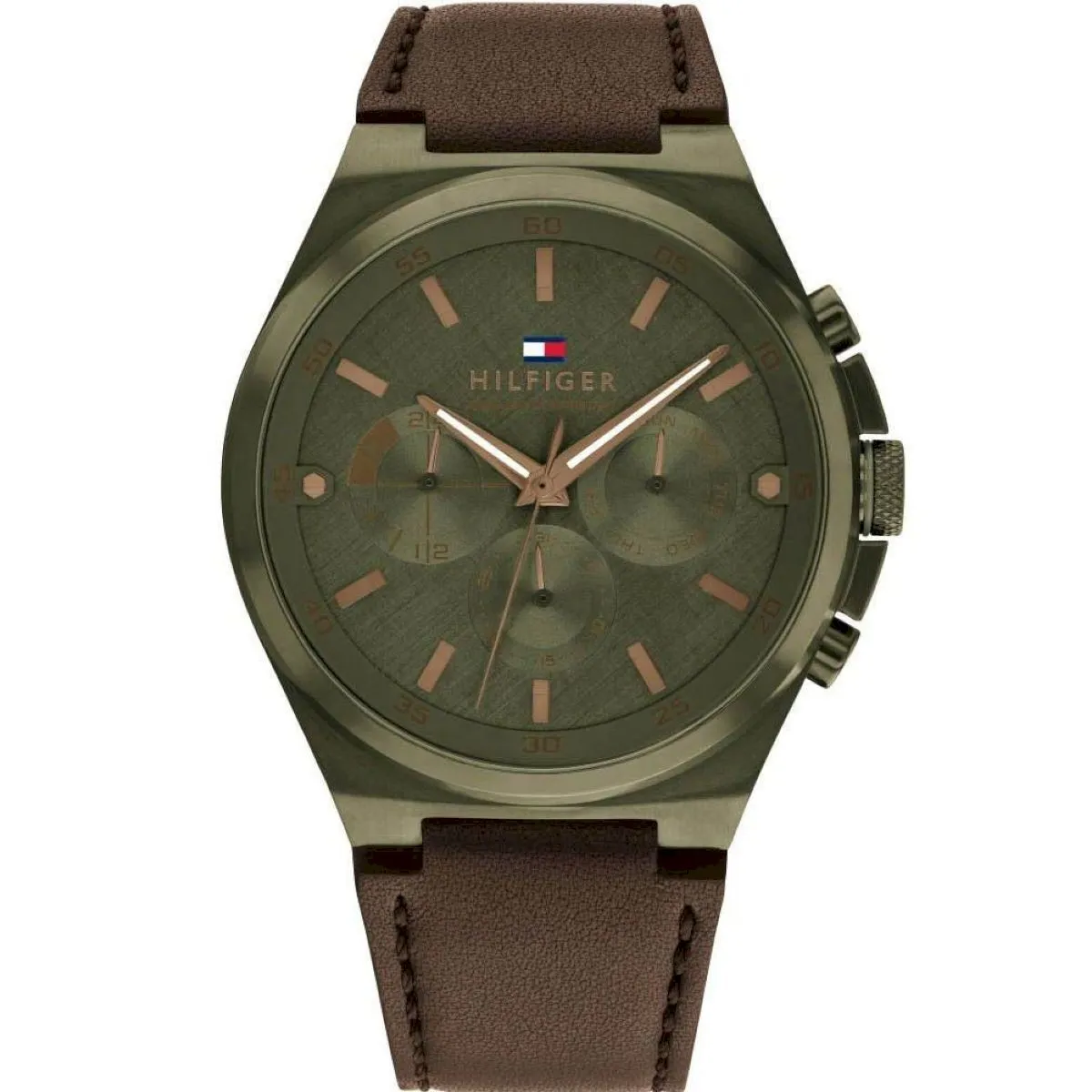 Zegarek Tommy Hilfiger 1792085 dla mężczyzn posiada zieloną okrągłą obudowę i brązowy pasek oraz zieloną tarczę z wyróżniającym się logo i nazwą marki. Nowoczesny i elegancki, dlatego spodoba się każdemu Mężczyźnie. Jak wszystkie zegarki Tommy Hilfiger 1792085 został wykonany z wysokiej jakości materiałów - jego koperta o szerokości 46.00 mm jest z wysokiej jakości stali szlachetnej, gwarantującej trwałość, odporność na korozję i wysoką odporność na uszkodzenia. Dzięki grubości obudowy około 12 mm zegarek 1792085 rewelacyjnie prezentuje się na nadgarstku, a dopasowany pasek skórzany zapewnia komfortowe użytkowanie. Kolorystyka została utrzymana w ponadczasowych barwach, które można wykorzystać do różnych outfitów. Na zielonej tarczy umieszczono rozpoznawalne logo marki oraz oznaczenia rozbudowanego wskazania daty - mamy tutaj dzień miesiąca, dzień tygodnia i czas w systemie 24godzinnym.