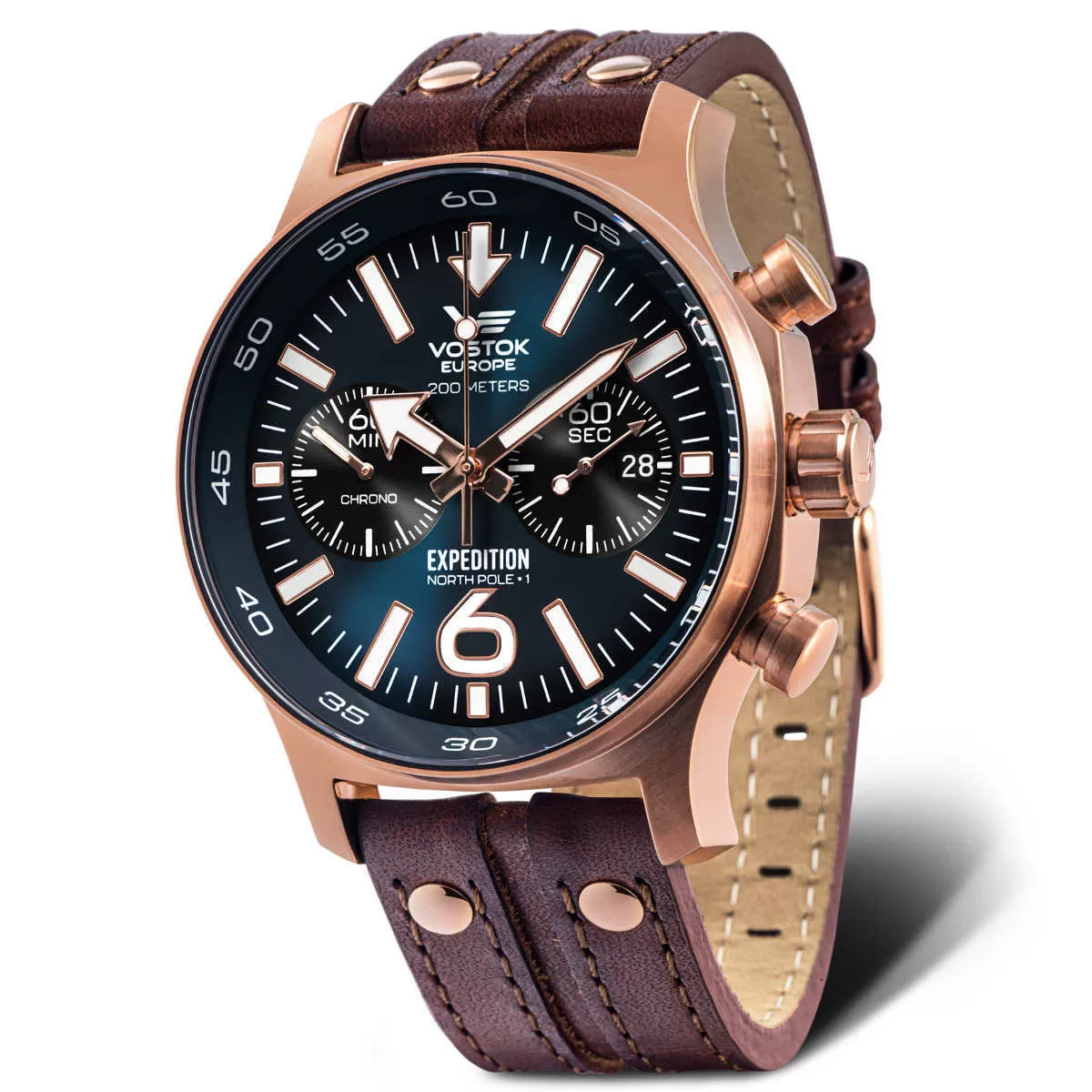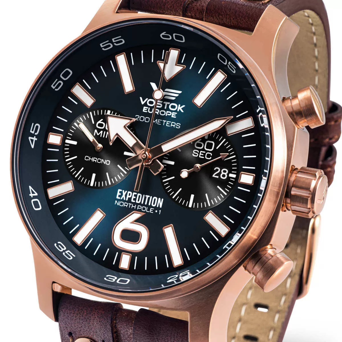 Zegarek Vostok Europe Expedition North Pole 6S21/595B645 z funkcją chronografu, czarną tarczą z białymi akcentami, w różowozłotej kopercie, połączonej ze skórzanym brązowym, wzmacnianym paskiem, działający na kwarcowym mechanizmie, z wysoką wodoszczelnością. Oznaczenia na tarczy są widoczne i proste, w formie indeksów i solidnych wskazówek pokrytych specjalną powłoką, które święcąc bardzo jasno w ciemności ułatwiają odczyt godziny. Sportowo-elegancki charakter podkreśla masywny design i dopracowane wykonanie nawet najmniejszych szczegółów oraz dynamiczne wykończenie i subtelne zakończenia linii koperty.