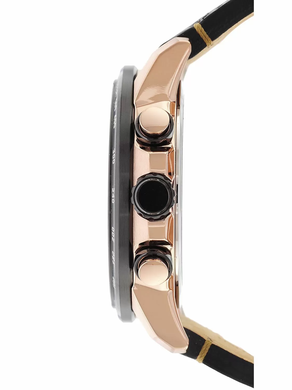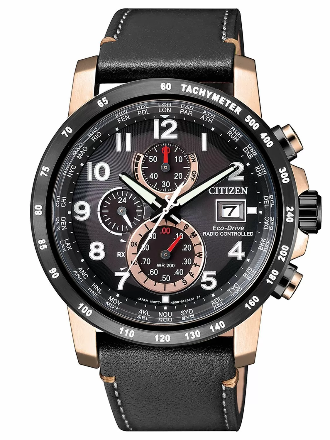 Designerski wygląd oraz wysoka funkcyjność zegarka Citizen Radio Controlled AT8126-02E sprawiają, że jest to model przeznaczony dla nowoczesnych mężczyzn szukających wysokiej jakości czasomierza, który ożywi wygląd każdej stylizacji. Koperta została wykonana ze stali szlachetnej, którą pokryto bardzo wytrzymałą powłoką PVD w dwóch kolorach, różowego złota oraz eleganckiej czerni. Wewnątrz koperty osadzono kwarcowy mechanizm, którego działanie uregulowane jest przez mikrokomórkę absorbującą promienie światła, która następnie przemienia je w energię elektryczną potrafiącą zasilać czasomierz nawet do 240 dni pobytu w całkowitej ciemności. Męski zegarek Citizen AT8126-02E posiada funkcje rozbudowanego stopera -chronografu oraz datownik wskazujący jaki jest aktualny dzień miesiąca w prostokątnym okienku osadzonym tuż obok miejsca wskazania godziny trzeciej. Wodoszczelność na poziomie 200M pozwala na kąpiel, pływanie, a nawet zanurzenie z akwalungiem. Kopertę zegarka zamyka szafirowe szkiełko odporne na zarysowania, wykluczając jedynie te które mogłyby powstać poprzez kontakt z diamentem.