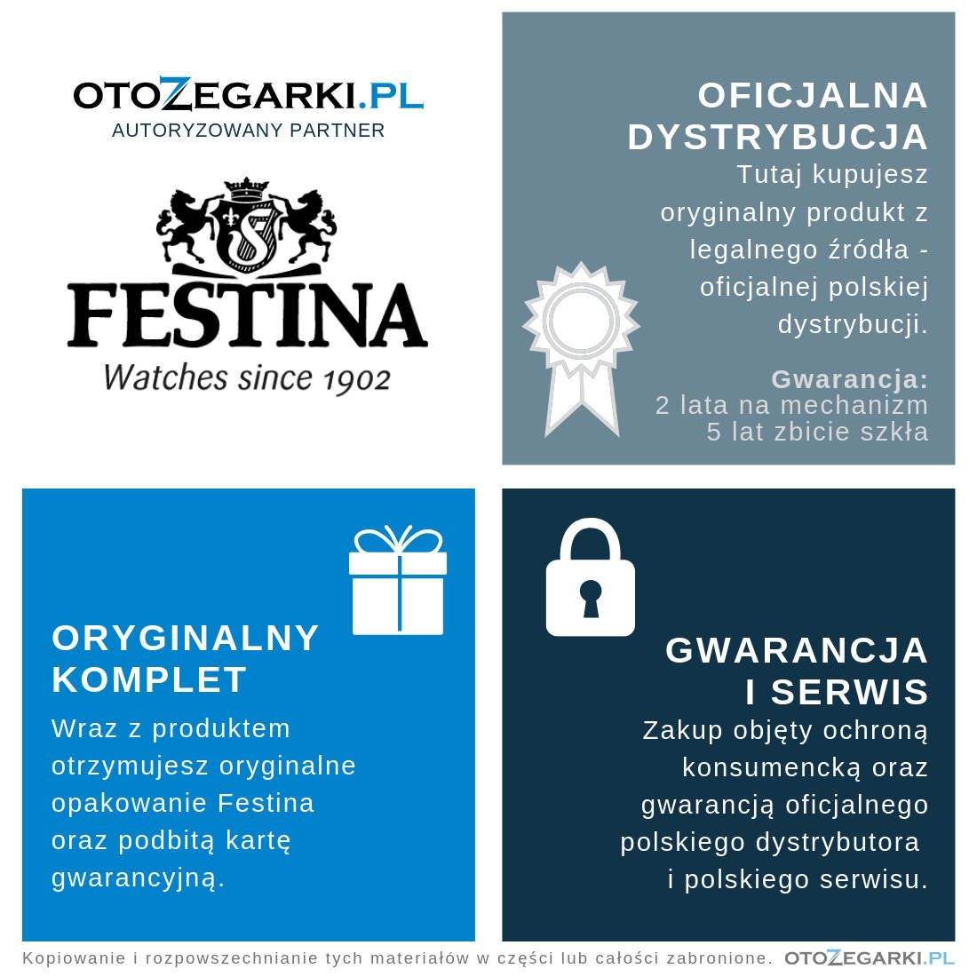 Kupując u nas w sklepie nie musisz obawiać się rozczarowania! Wszystkie zegarki Festina z naszej oferty to oryginalne, nowe i pełnowartościowe produkty, które pochodzą z legalnej polskiej dystrybucji, która także zapewnia serwisowanie w Polsce i dostęp do części. Zakup w naszym sklepie jest całkowicie legalny i zgodny z polskim prawem, co gwarantuje Ci ochronę jako konsumenta w przypadku zakupów na odległość! Przy zakupie zegarka Festina otrzymujesz: