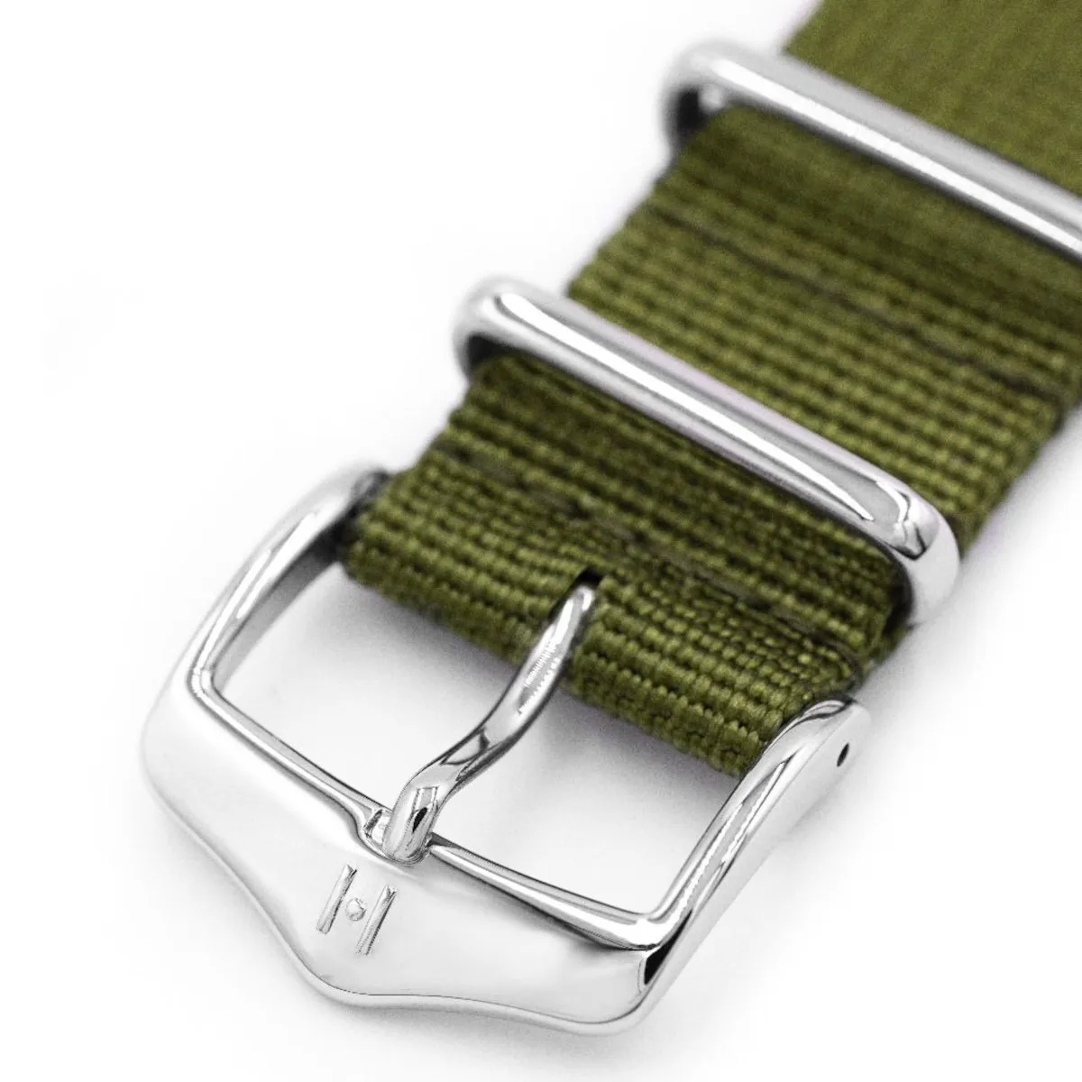 Tekstylny pasek z lini HIRSCH Rush Recycle ma kultowy charakter i wykonany został z wtórnie wprowadzonego do produkcji poliestru, co sprzyja ochronie środowiska, jego zielona kolorystyka pasuje do szerokiej gamy zegarkówWykonany z materiału, całkowicie wodoodporny, stabilny wymiarowo, odporny na rozdarcie, promieniowanie UV, chemikalia, pot, ekstremalne ciepło lub zimno. Rozmiar 20 mm, klamerka w kolorze srebrnym, ceniona austriacka marka Hirsch. Urbane nie posiada przeszyć co czyni go bardziej uniwersalnym.