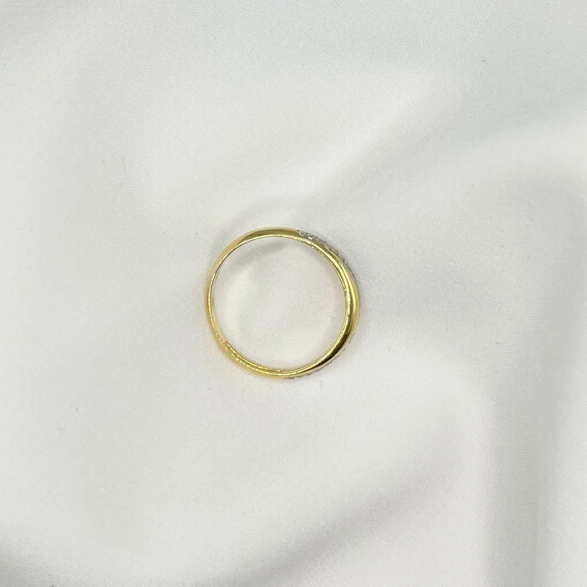 Elegancki pierscionek wykonany został z żółtego złota z elementami rodowanymi, o próbie 585.